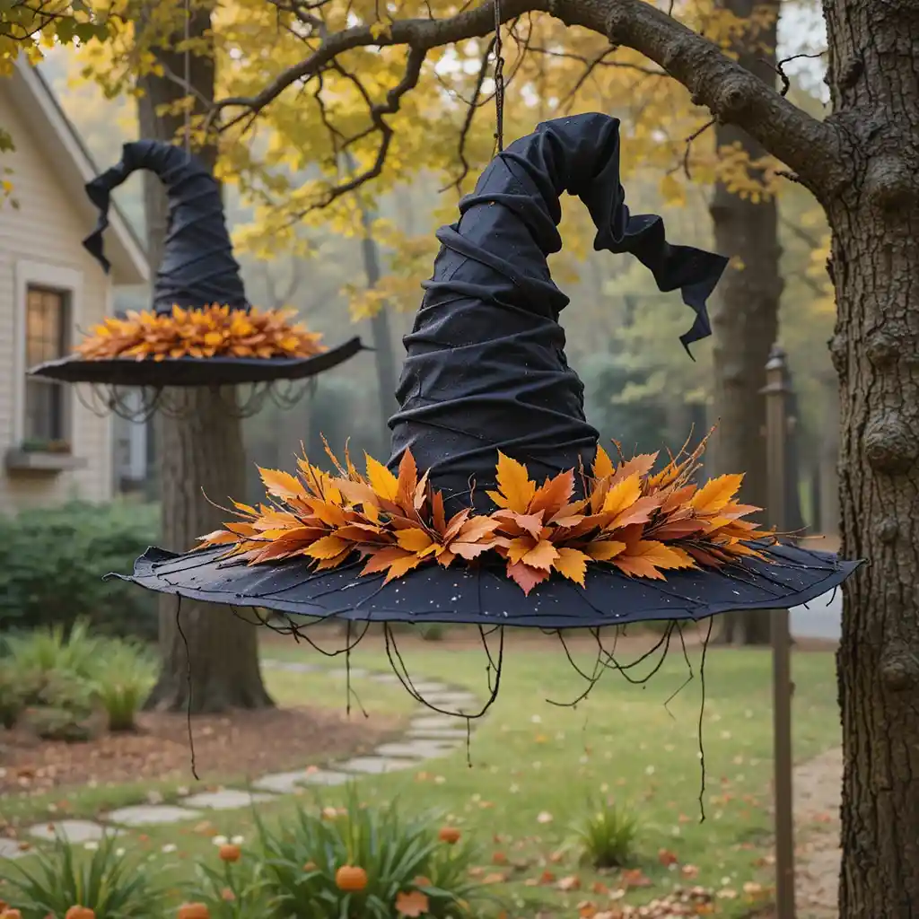 Hang oversized witch hats from trees and decorate their brims with bursts of colorful leaves for a festive twist.