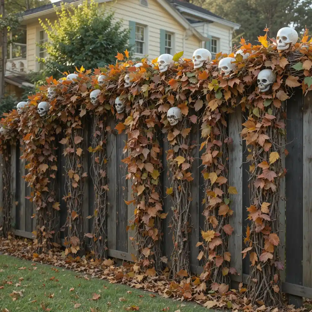 Attach bunches of autumn leaves to your front yard fence, then weave in skulls or creepy props for a haunted forest feel.