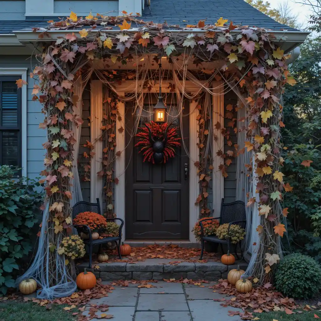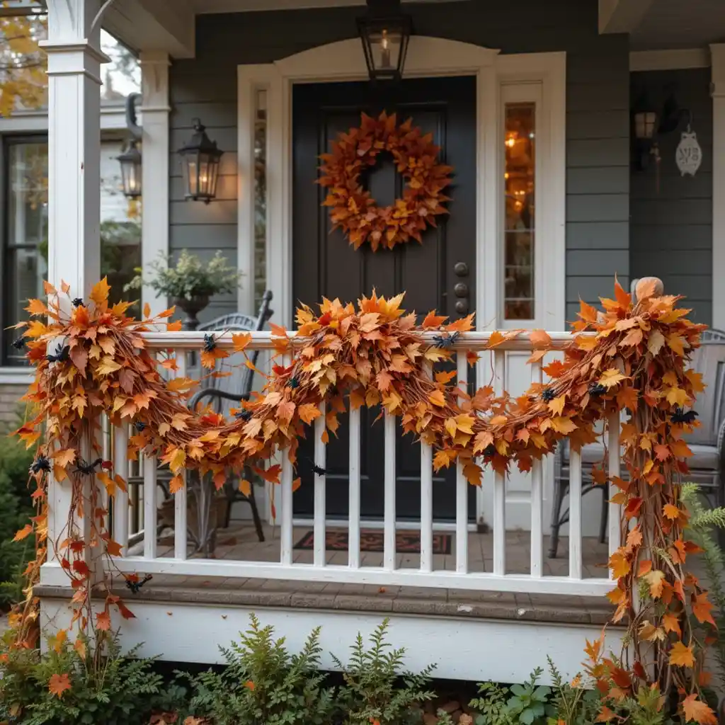 Drape garlands made of colorful autumn leaves across your porch railings. Add tiny black spiders or bats for that extra Halloween flair.