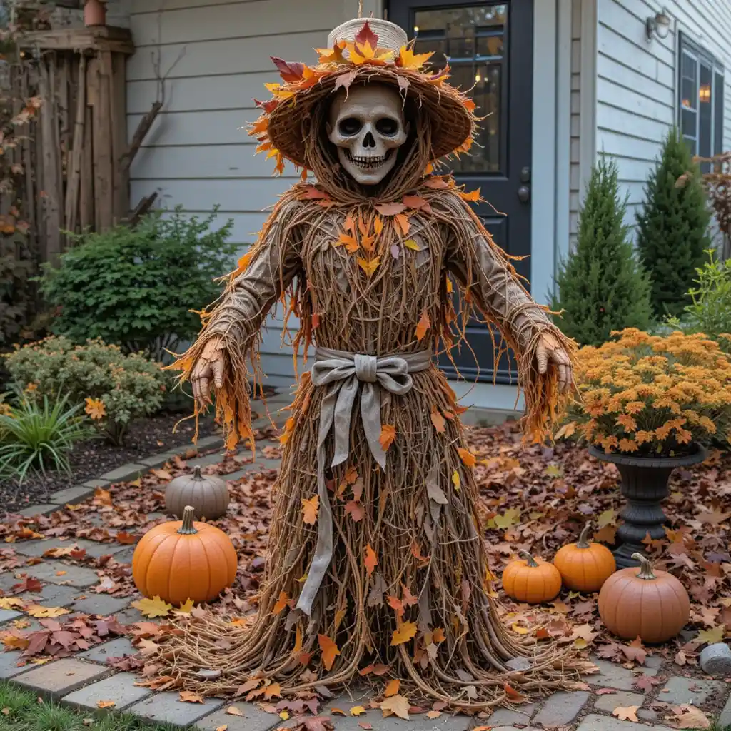 Build a life-sized scarecrow using dry leaves for stuffing. Dress it in tattered clothes and add a creepy mask to keep trick-or-treaters on edge.