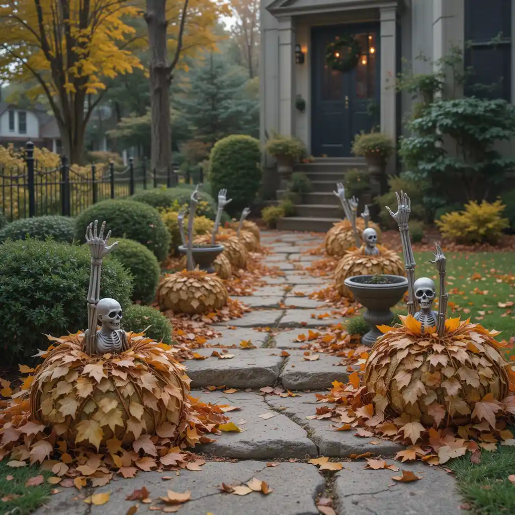 Line your walkway with piles of crunchy leaves and hide eerie props inside, like skeleton hands or fake rats peeking out.