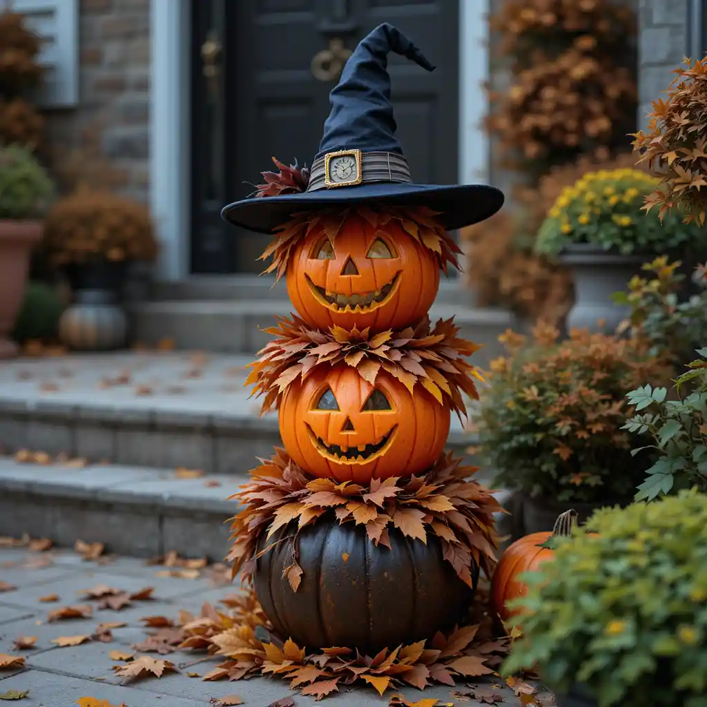 Stack pumpkins of different sizes with layers of autumn leaves between each one. Top it with a spooky witch hat for a dramatic porch statement.