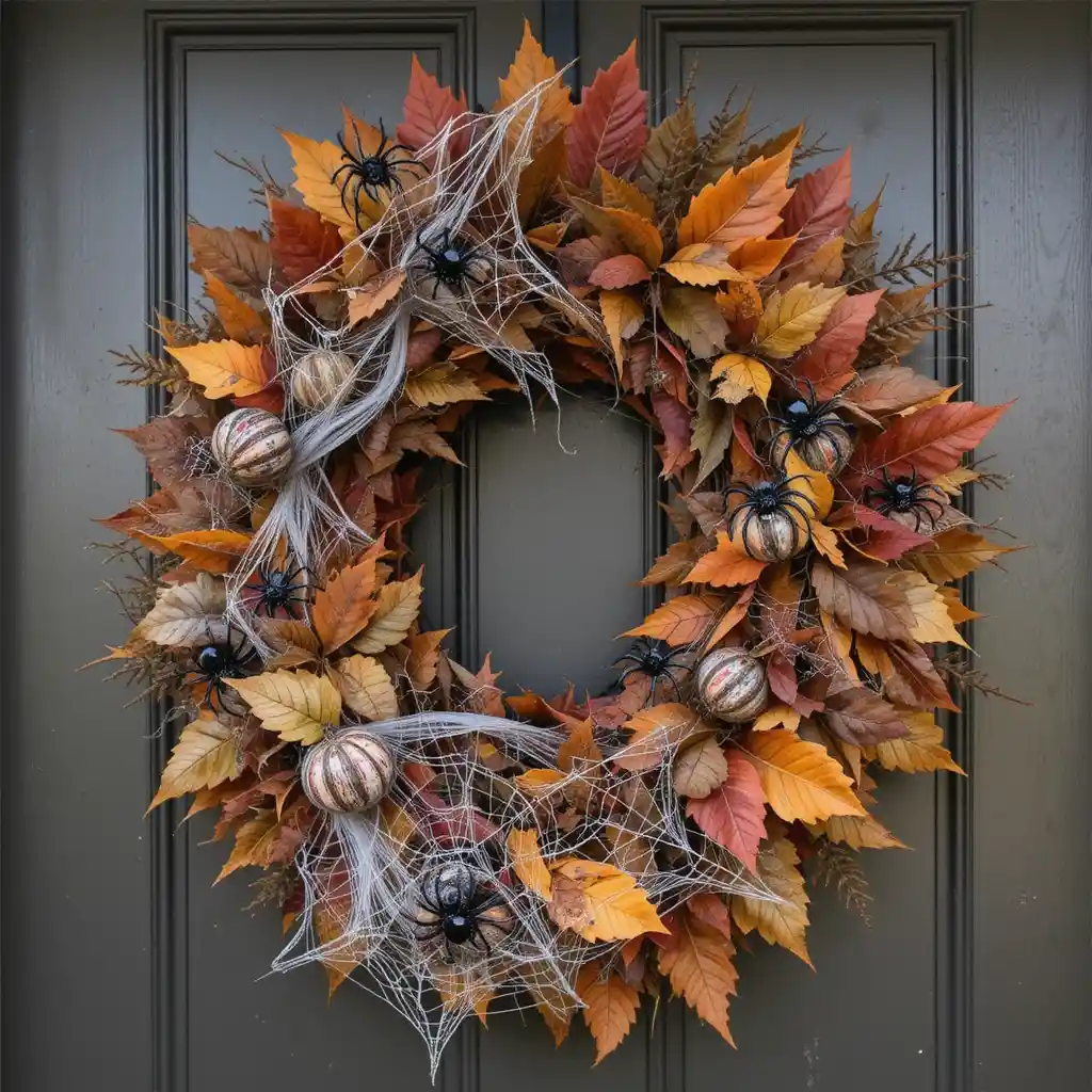 Create a front-door wreath with autumn leaves, then layer over creepy spider webs and plastic spiders for a seasonal yet spooky look.