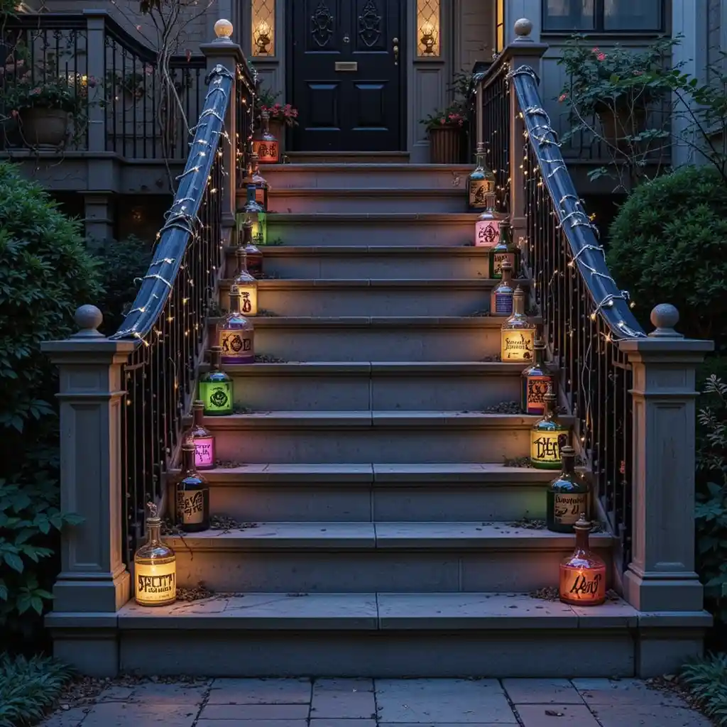 Arrange colored glass bottles with creepy labels along the staircase edge, lit from behind with fairy lights for a witchy ambiance. Best Halloween Staircase Decor Ideas