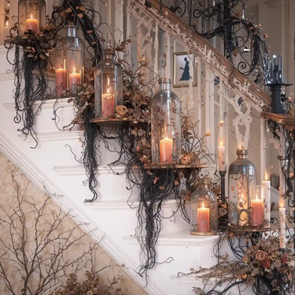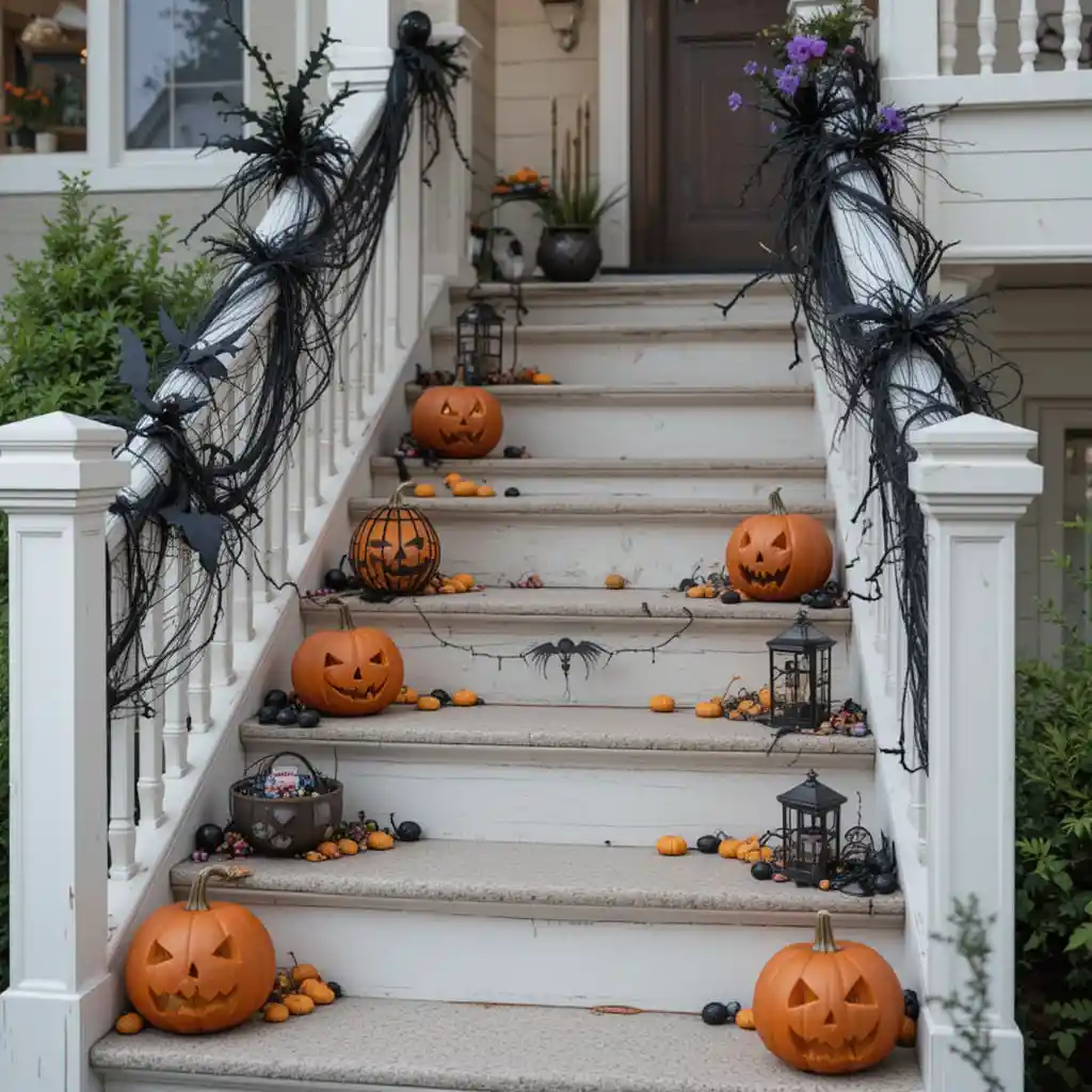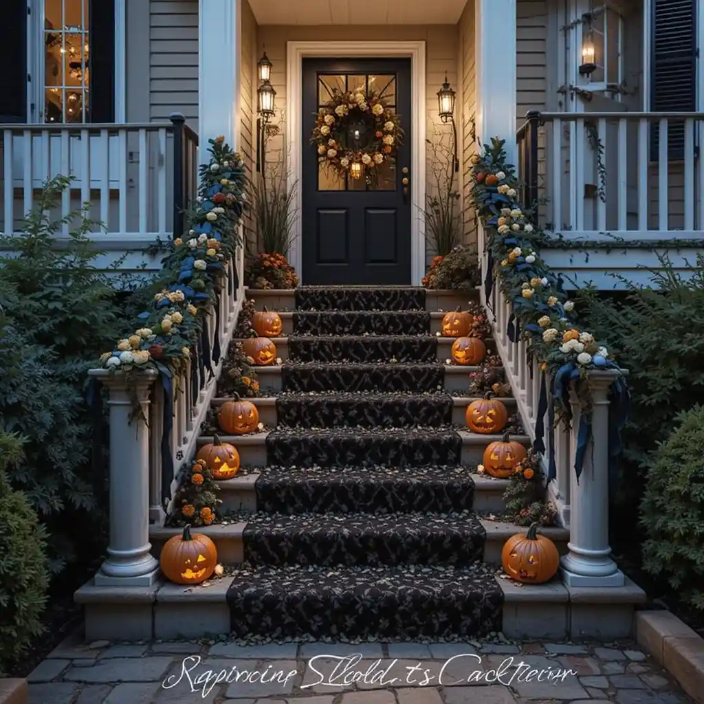 Line your staircase—inside or out—with carved or faux pumpkins, each glowing with LED candles for a warm yet spooky evening welcome.