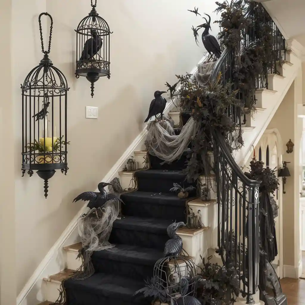 Hang or set black-painted birdcages with faux ravens, cobwebs, or skeleton hands inside for a gothic look.