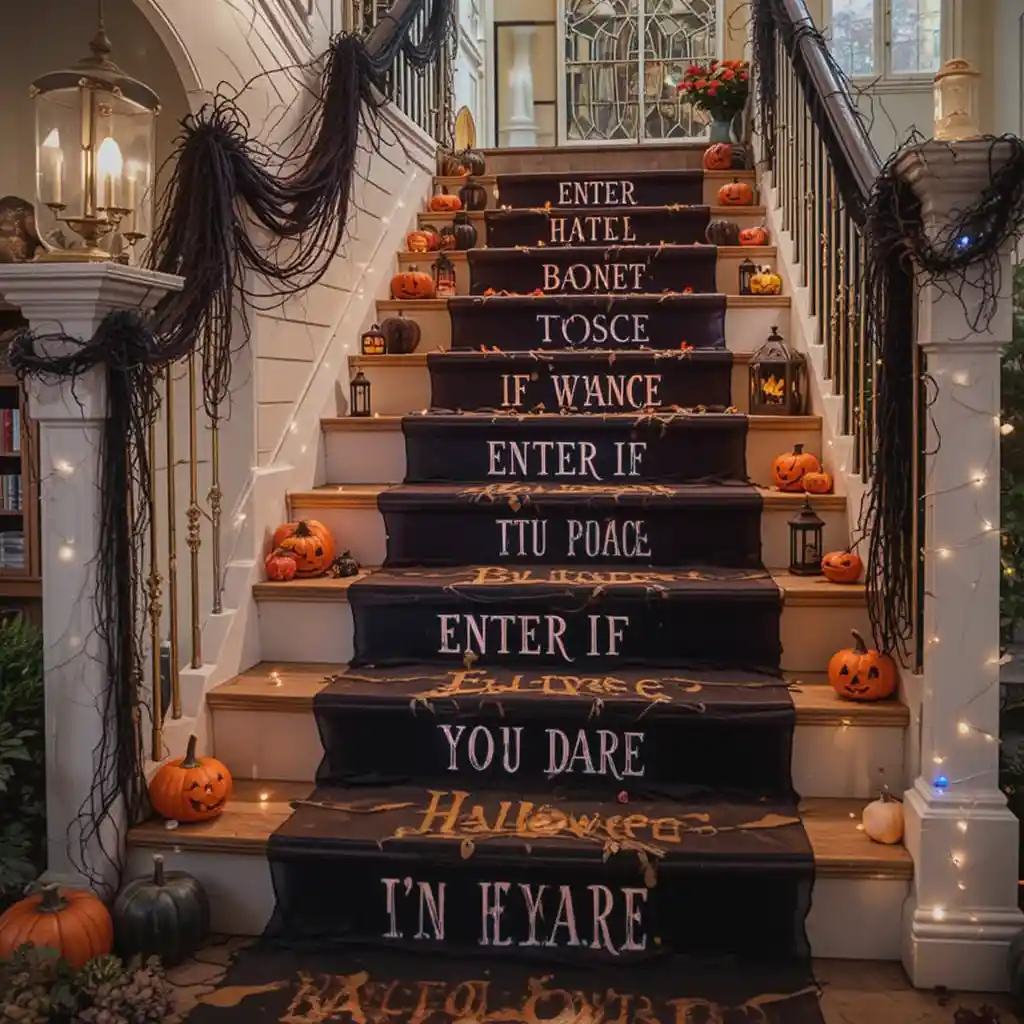 Apply Halloween-themed phrases like “Beware” or “Enter If You Dare” to each stair riser for a spooky, interactive touch.