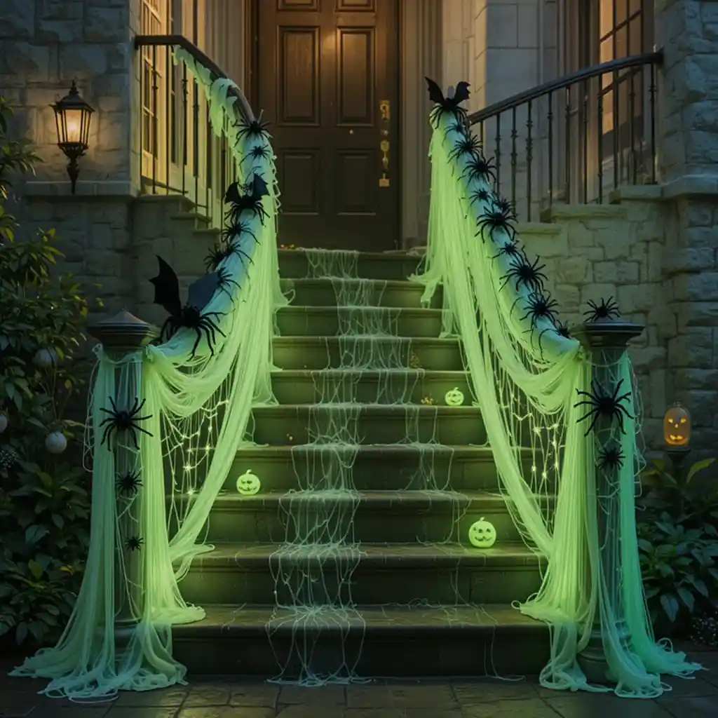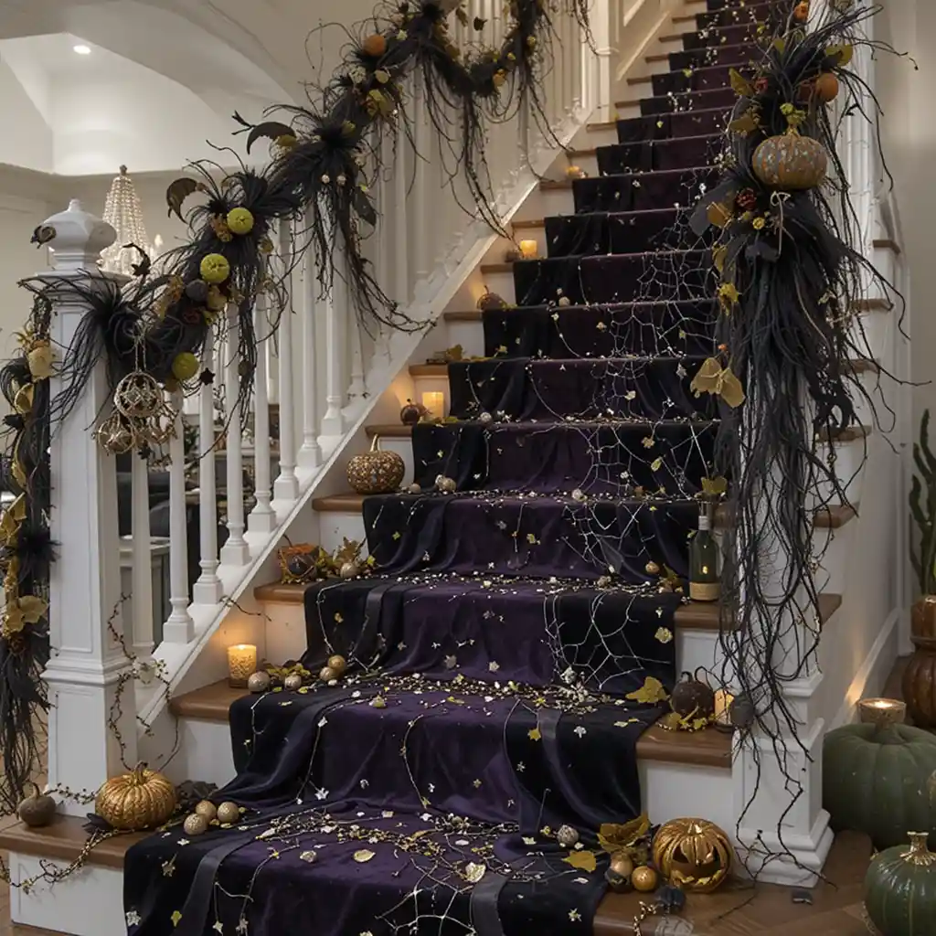 Wrap your stair railings in soft, stretchy faux spider webs, adding a few oversized black spiders for a dramatic and eerie effect.