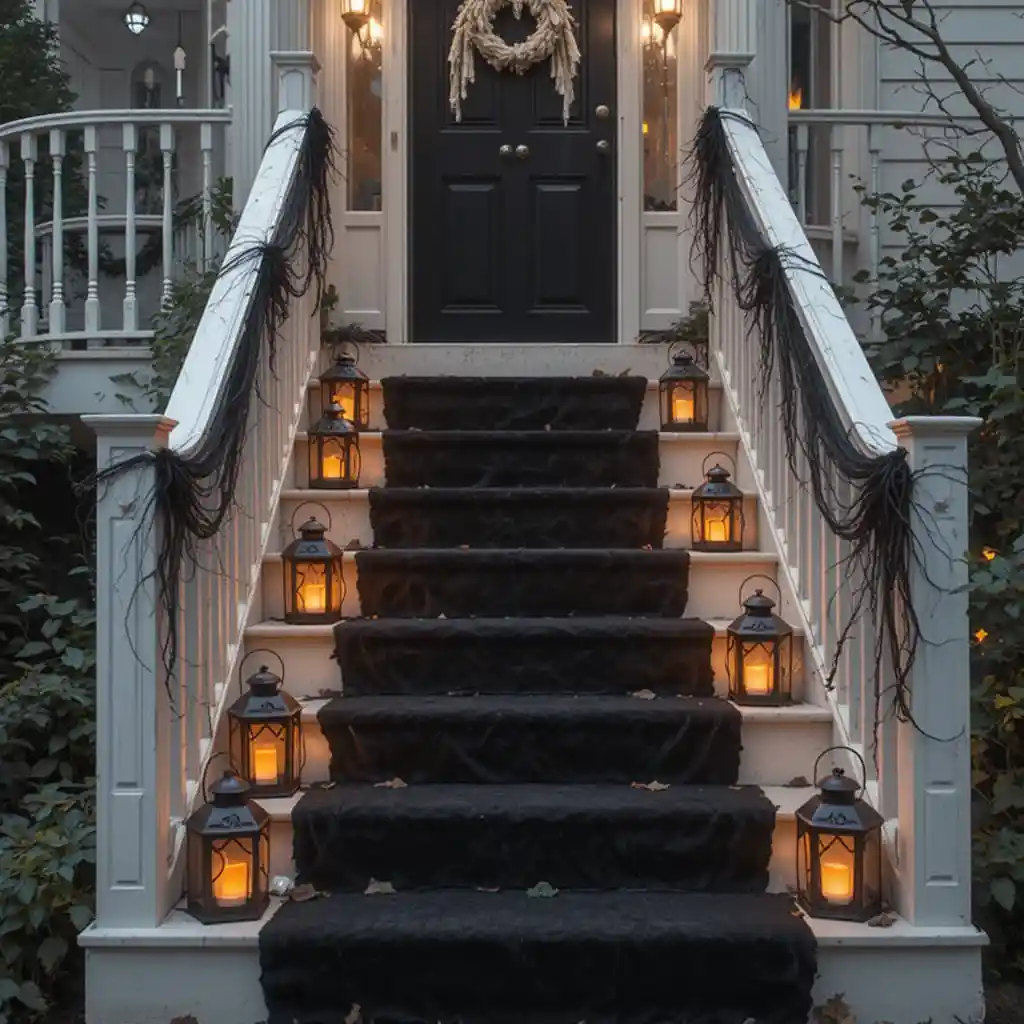 Place black lanterns filled with flickering orange lights or candles on each step to guide guests with an ominous glow.
