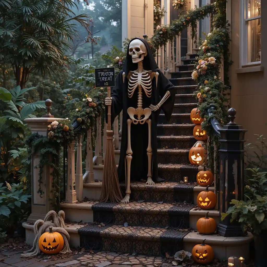 Set a life-sized skeleton holding a trick-or-treat sign or broom on the staircase landing to surprise anyone walking by.