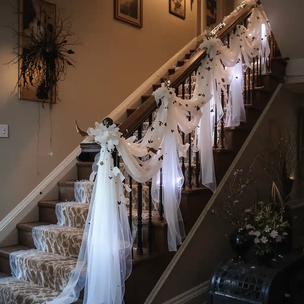Drape white cheesecloth or gauzy fabric along the banister to mimic floating ghosts drifting down the stairs.