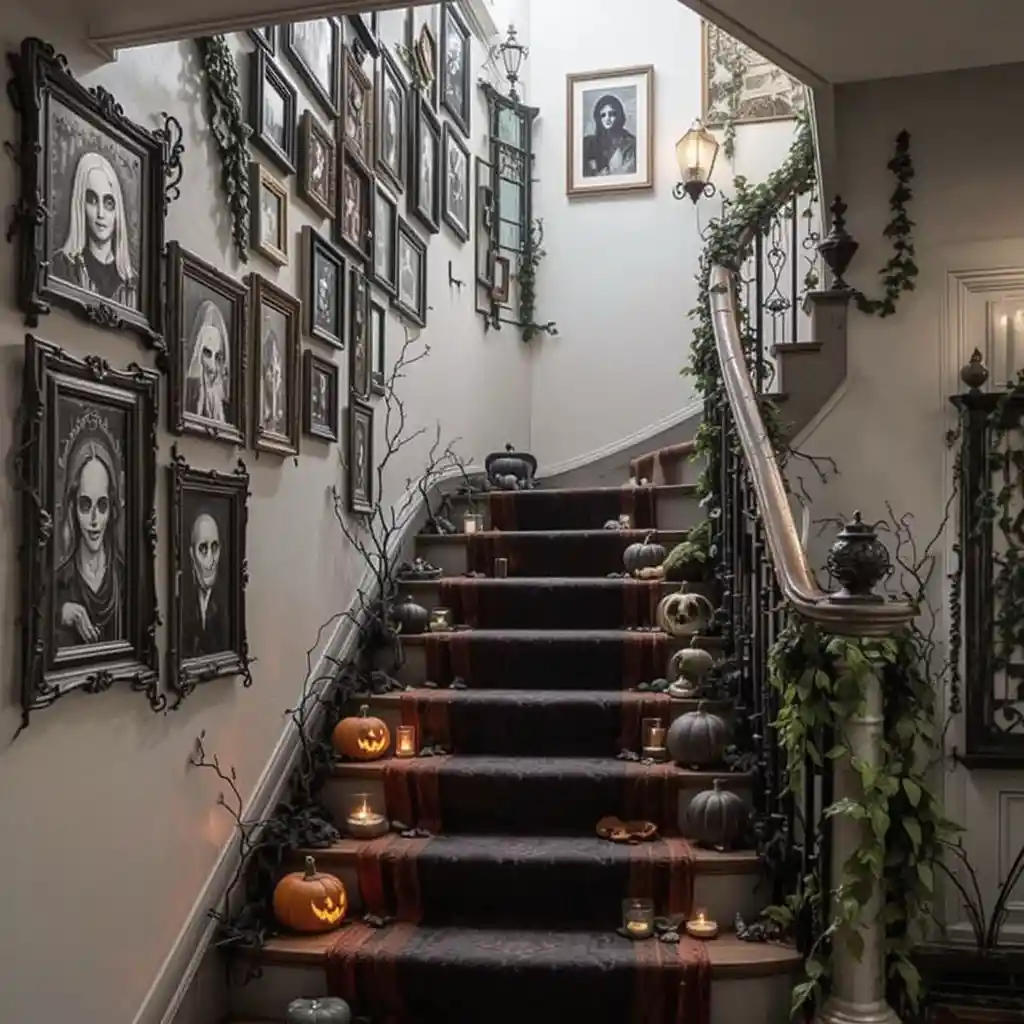 If your staircase has wall space, hang vintage-style frames with creepy Halloween art or black-and-white haunted portraits for a chilling vibe. Halloween Staircase Decor Ideas