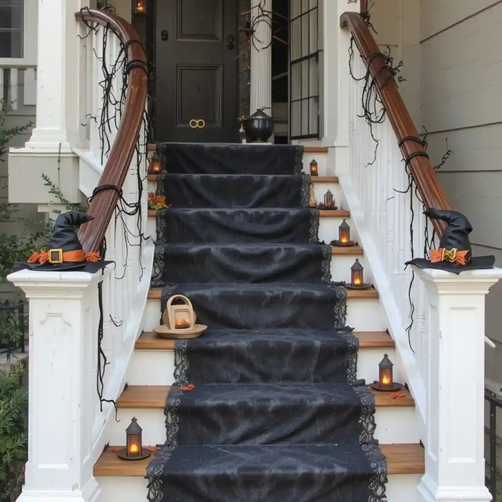 Place miniature witch hats at the top of each newel post or step for a whimsical nod to Halloween magic.