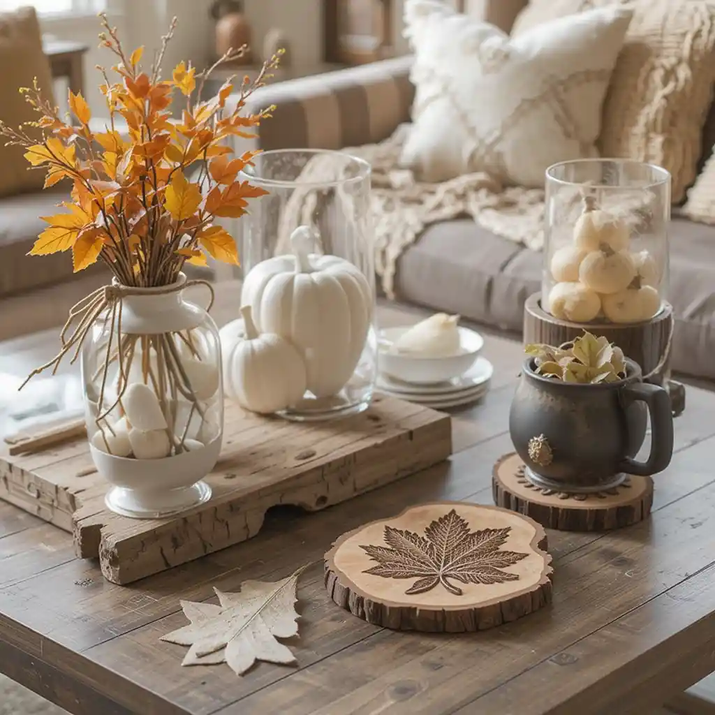 Display leaf-engraved wooden coasters for practical yet beautiful accents. They complement fall themes and add detail without clutter.