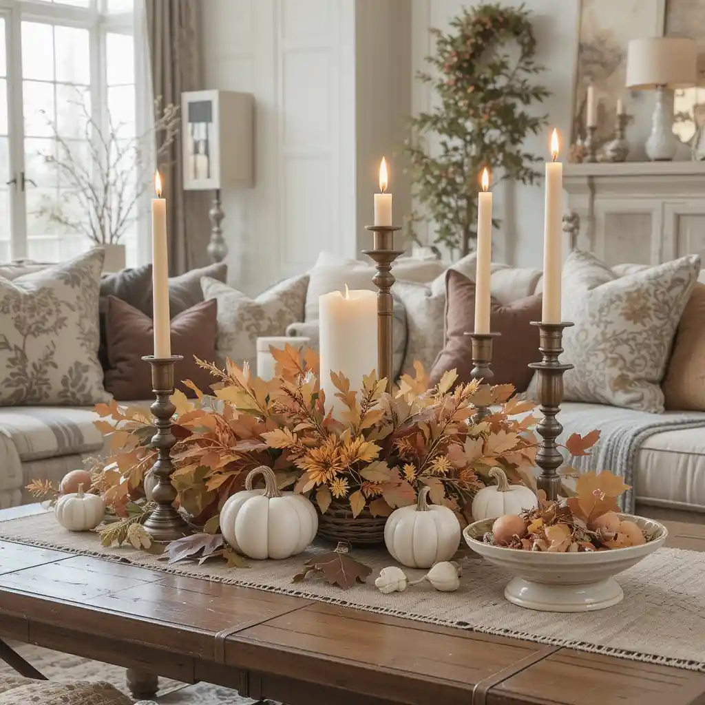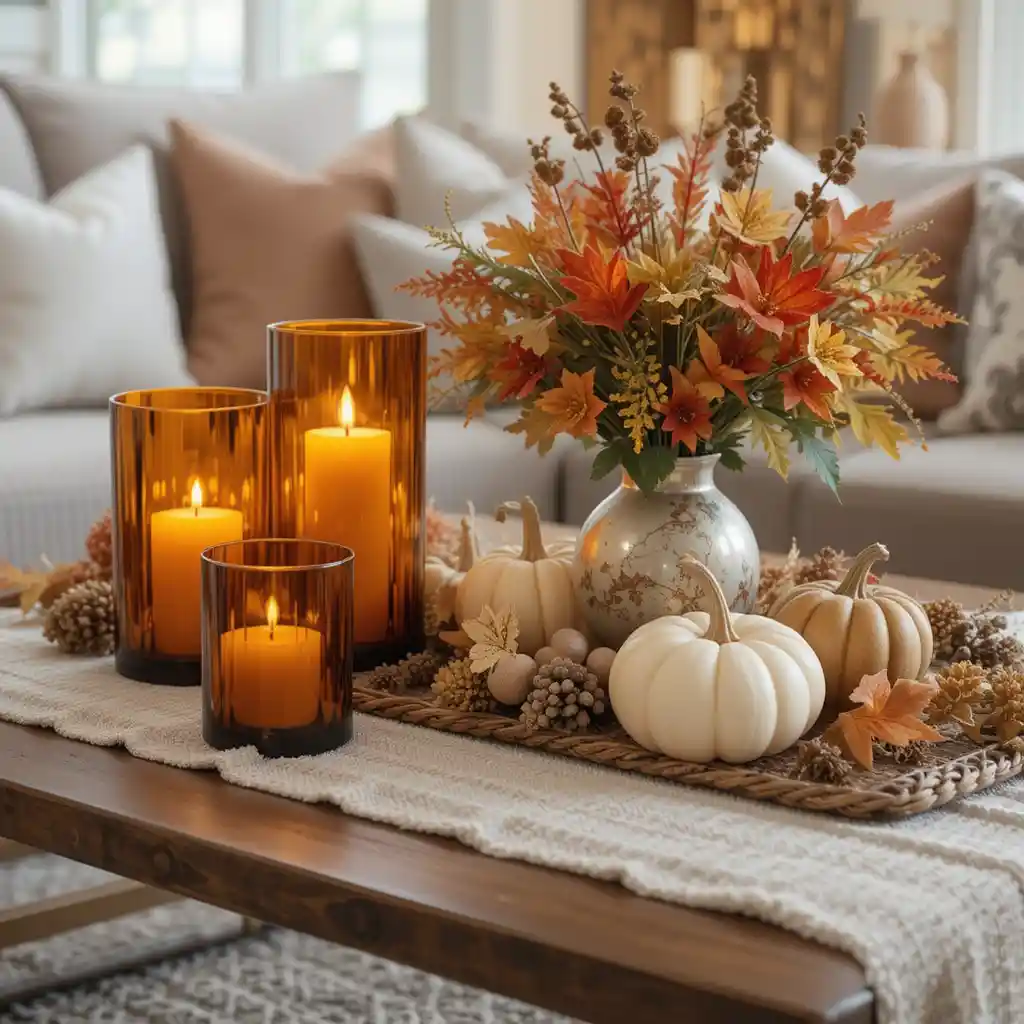 Amber-colored glass holders cast a warm, golden light across the table. Pair them with cinnamon or pumpkin-scented candles for that autumn aroma. Fall Living Room Table Décor