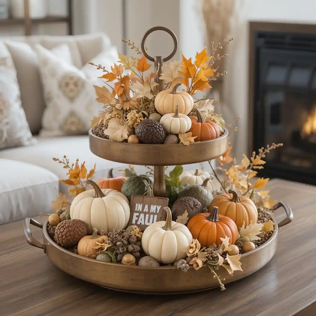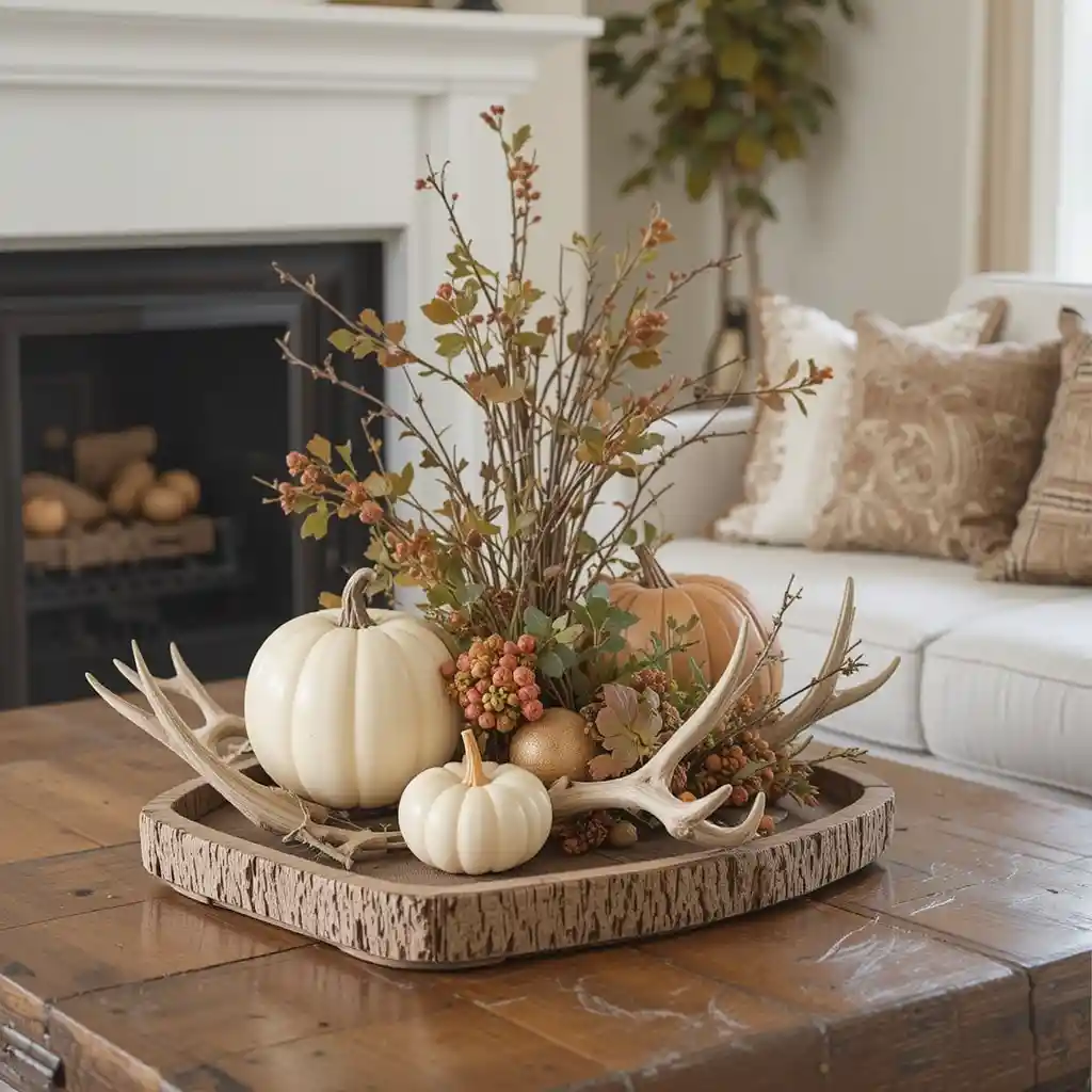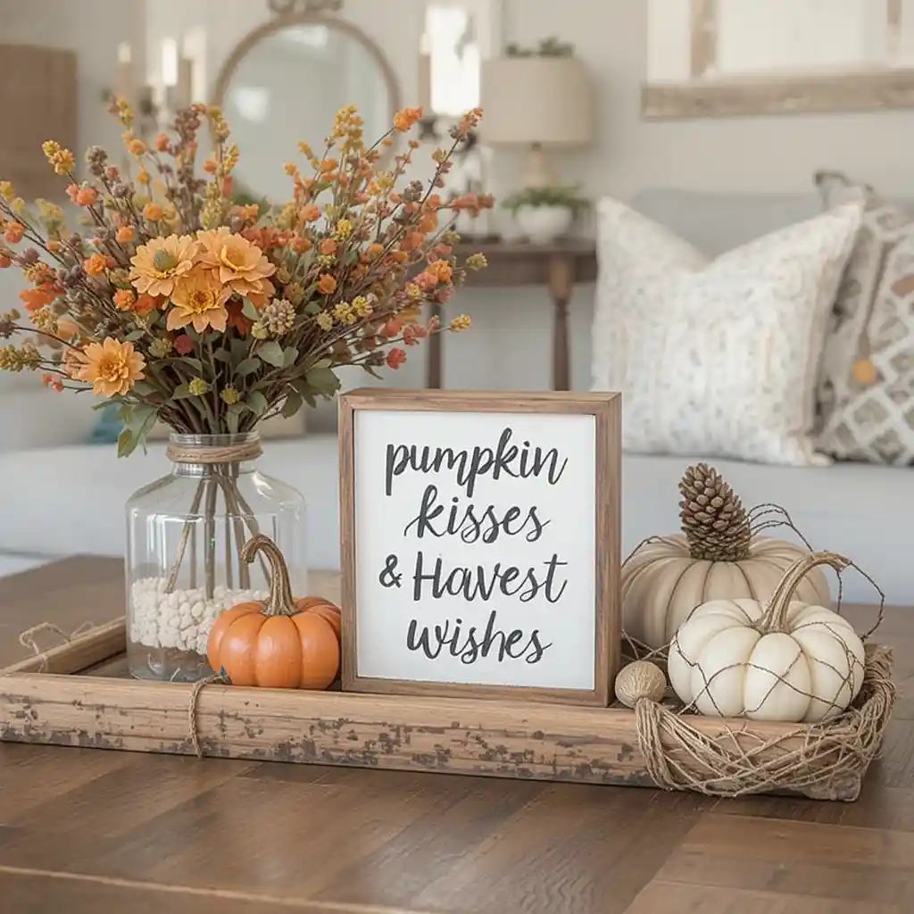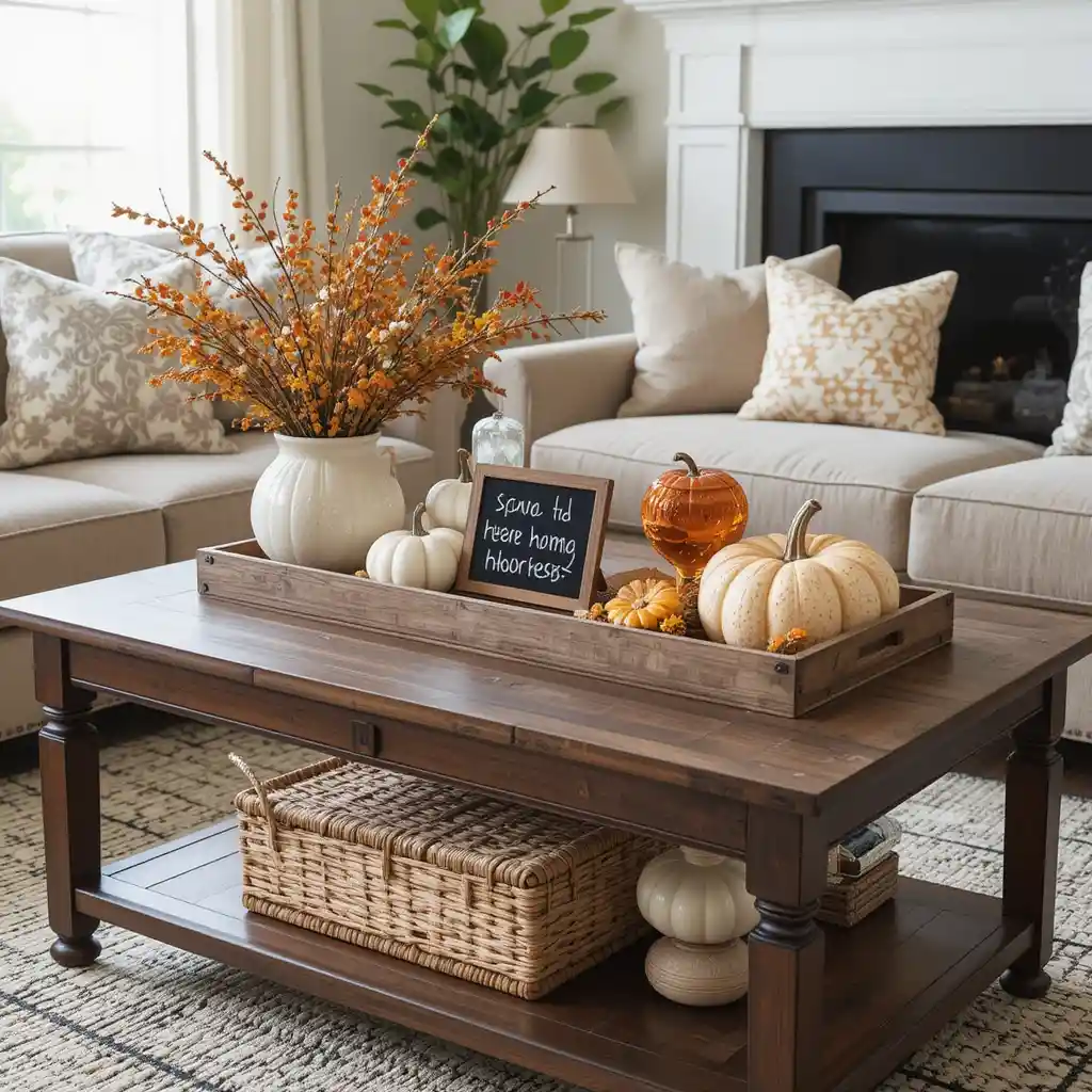 A rustic wooden tray filled with mini pumpkins adds a cozy harvest feel. Use varying sizes and soft orange, cream, or green tones for a natural look. Fall Living Room Table Décor