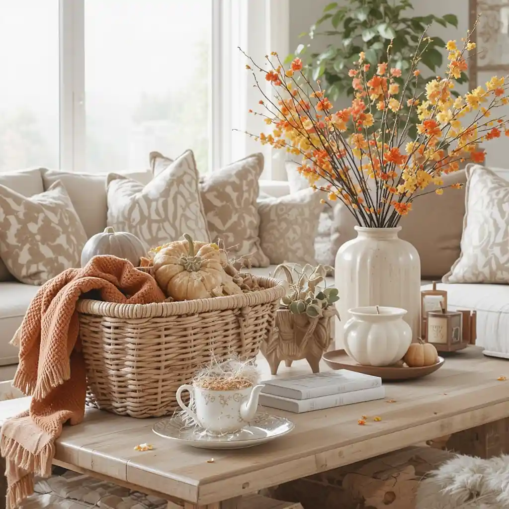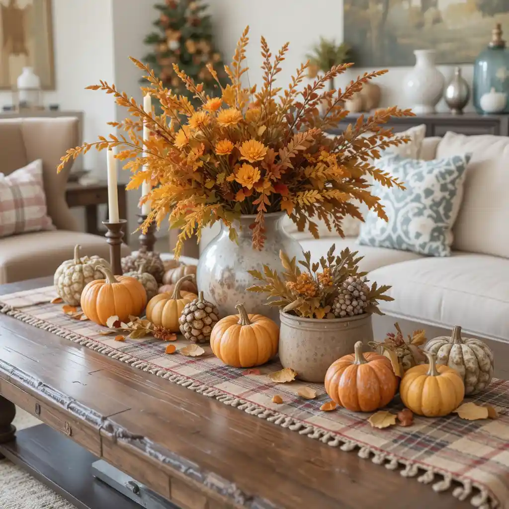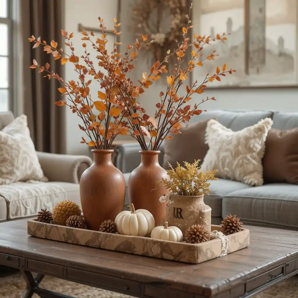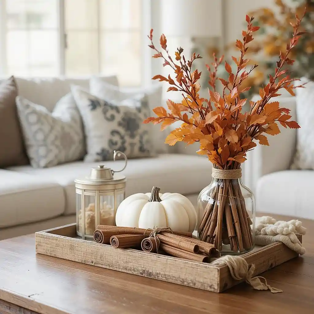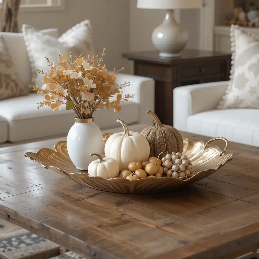 A rustic wooden tray filled with mini pumpkins adds a cozy harvest feel. Use varying sizes and soft orange, cream, or green tones for a natural look. Fall Living Room Table Décor