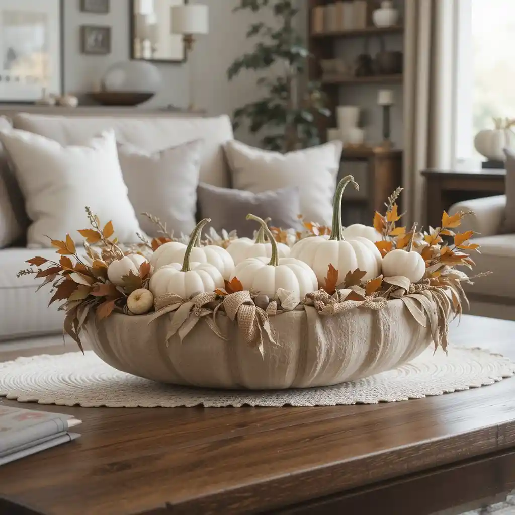 Use a long dough bowl and fill it with white pumpkins, leaves, and fabric filler. This creates a neutral centerpiece that’s both modern and cozy.