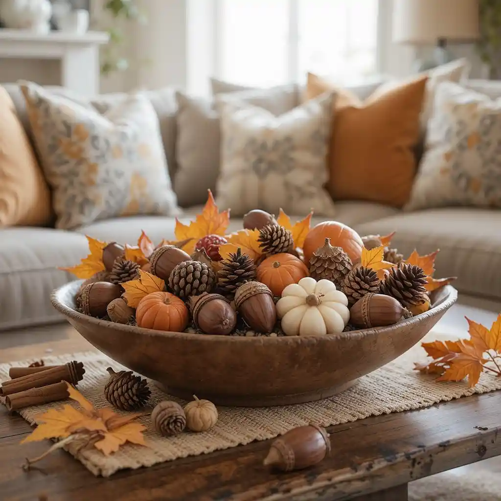 Fill a shallow wooden bowl with pinecones and acorns for a woodland touch. You can add a few cinnamon sticks or dried orange slices for extra detail.