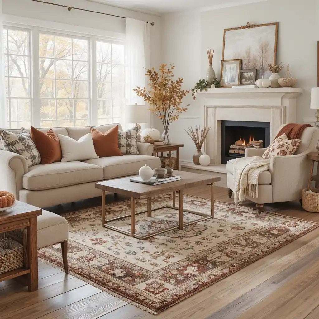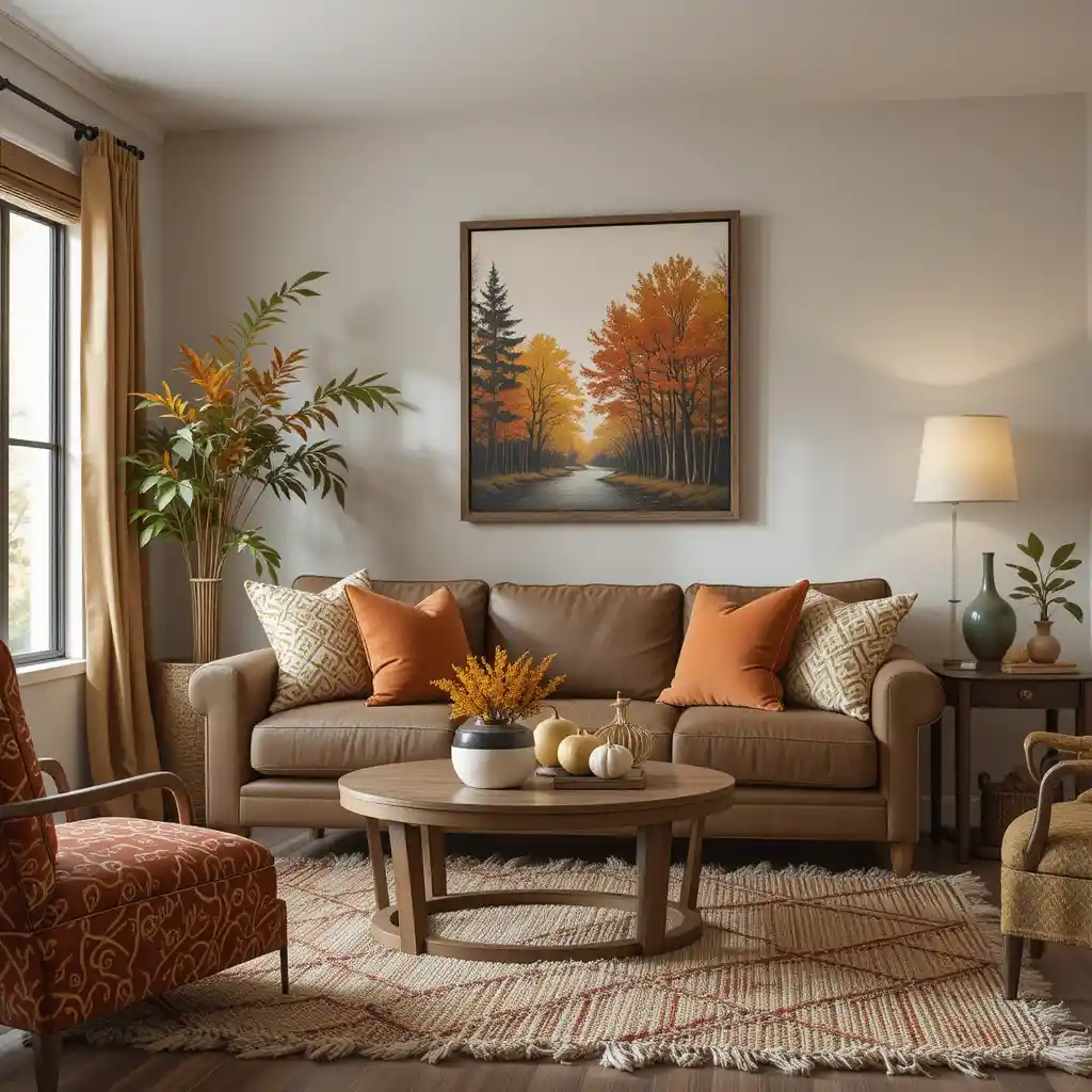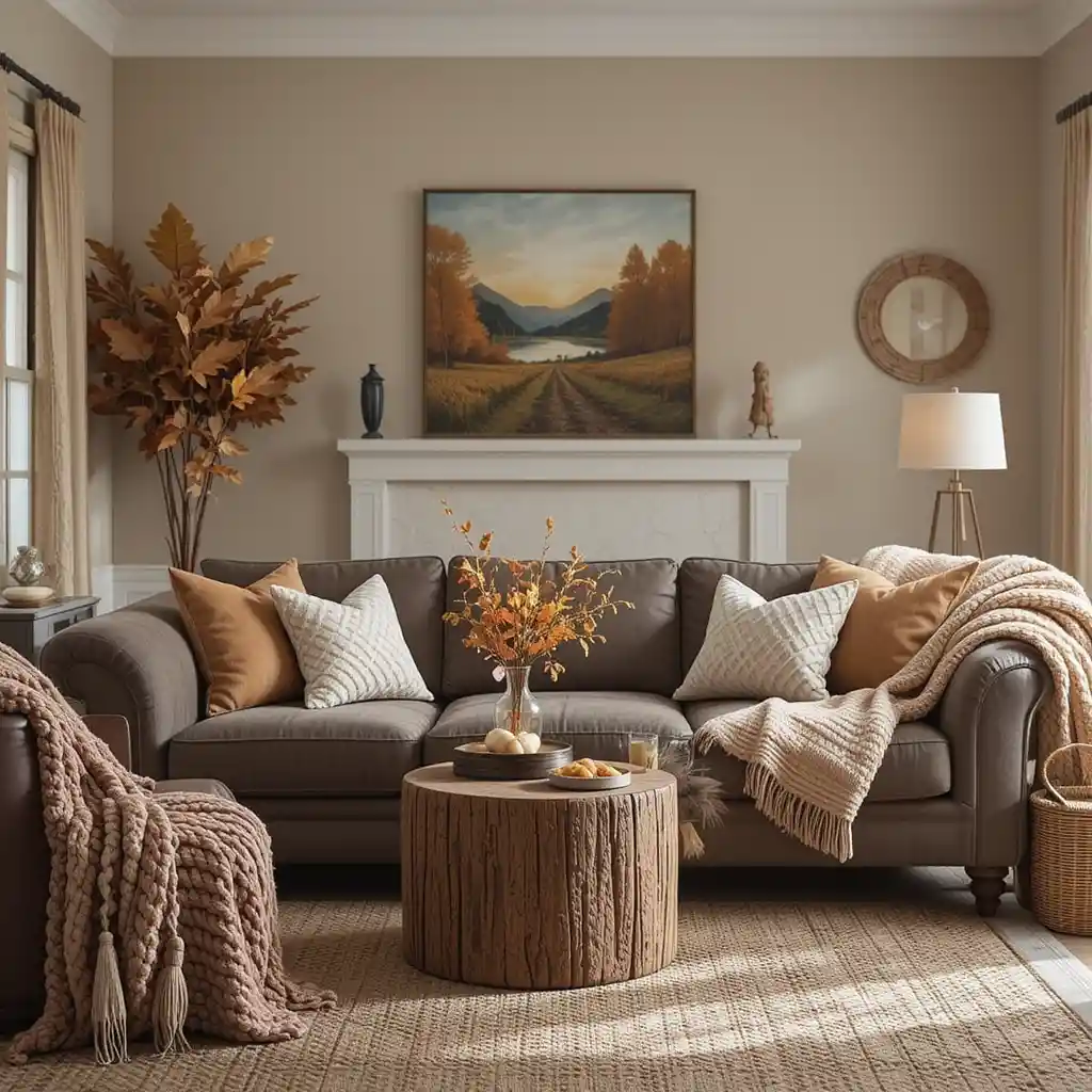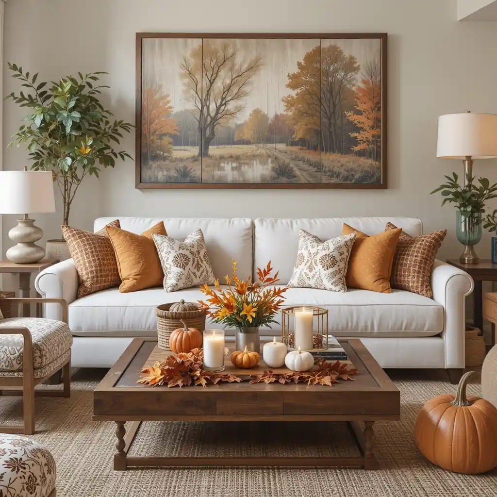 Introduce tones like rust, burnt orange, mustard, and forest green to your living room through throw pillows, wall art, or accessories. These colors instantly bring the essence of fall indoors.