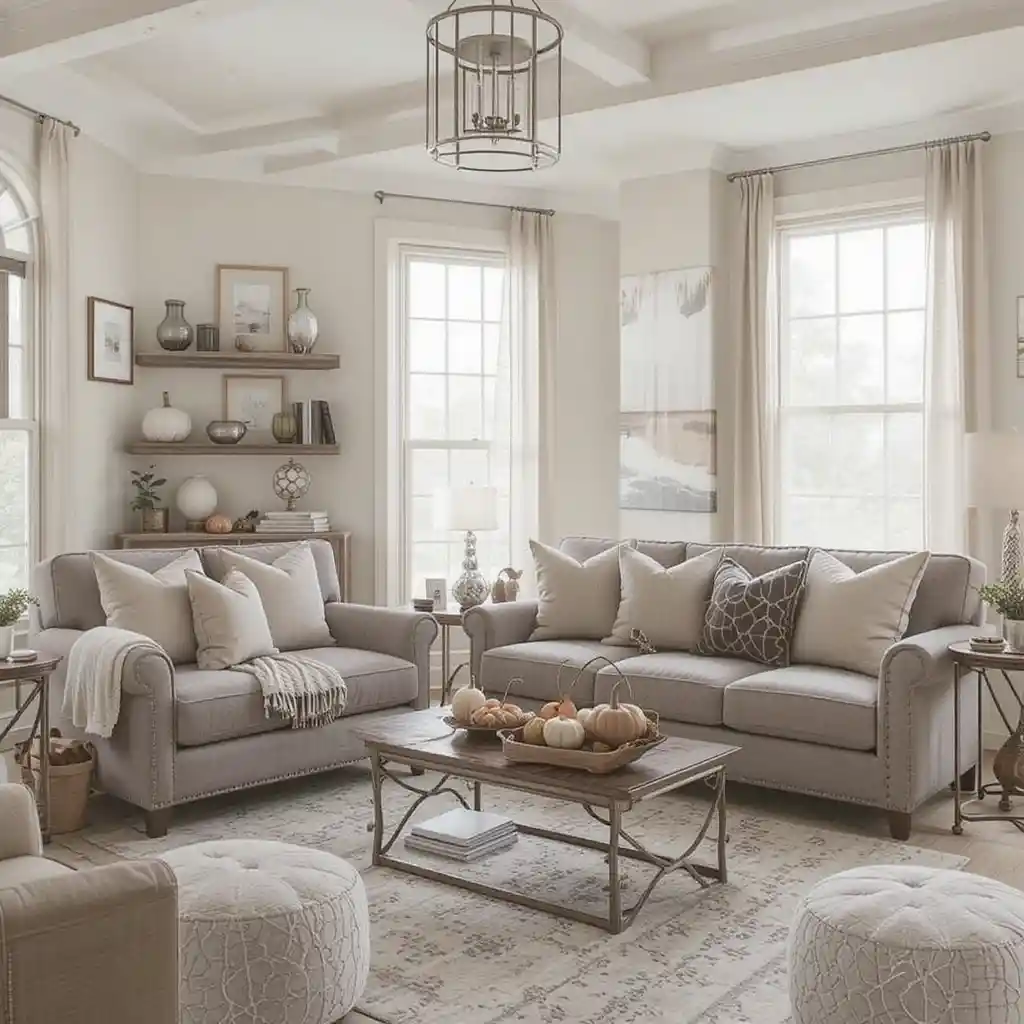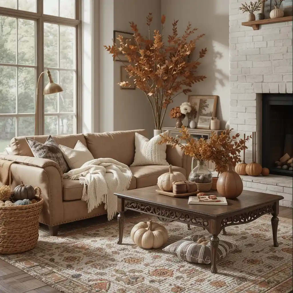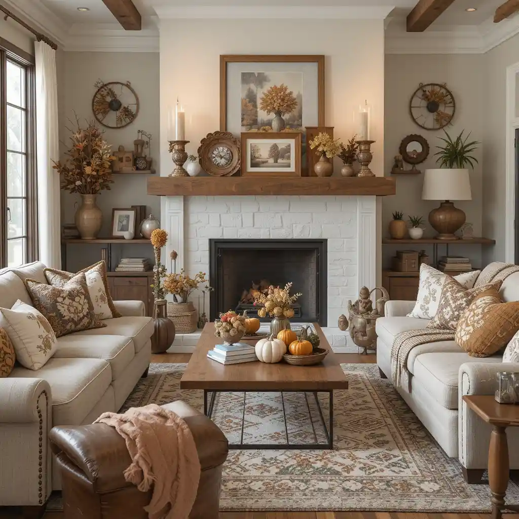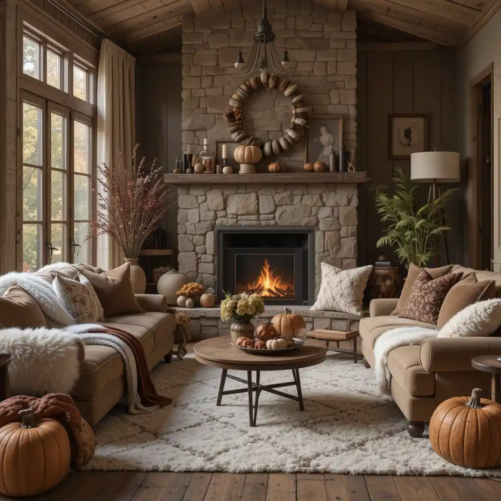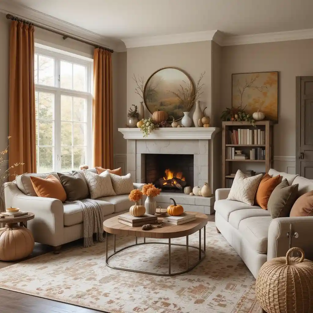 Introduce tones like rust, burnt orange, mustard, and forest green to your living room through throw pillows, wall art, or accessories. These colors instantly bring the essence of fall indoors.