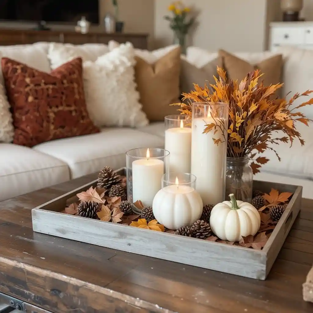 Curate a tray with fall-scented candles, pinecones, and a mini pumpkin to make your coffee table feel intentional and seasonal.