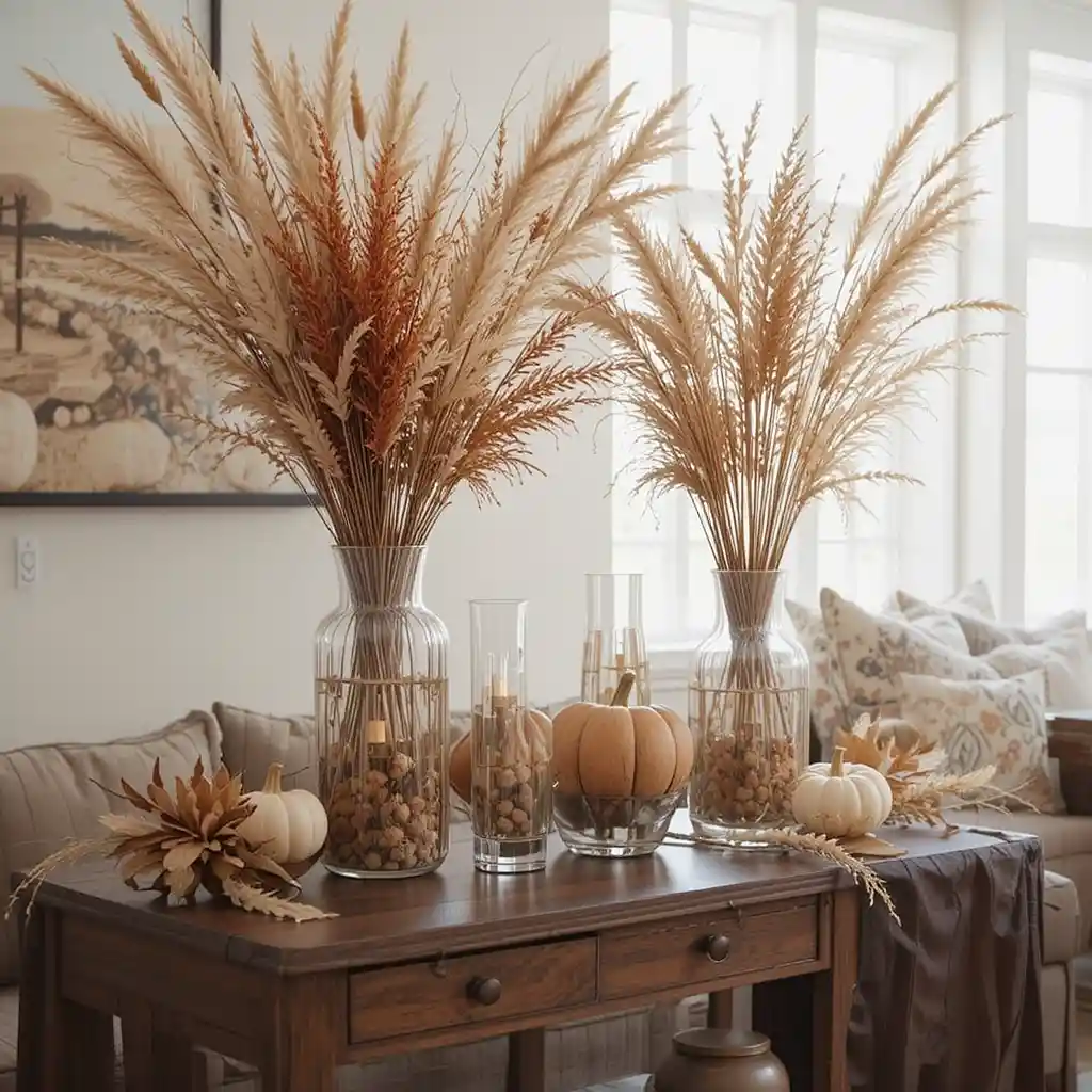 Use vases filled with dried florals, pampas grass, or wheat stalks to bring an organic, harvest-inspired look to your living room.
