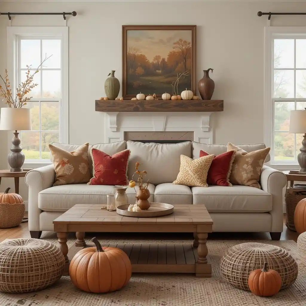 Switch your throw pillows to rich seasonal colors like cranberry, burnt sienna, and olive green, using varying sizes for a layered look.