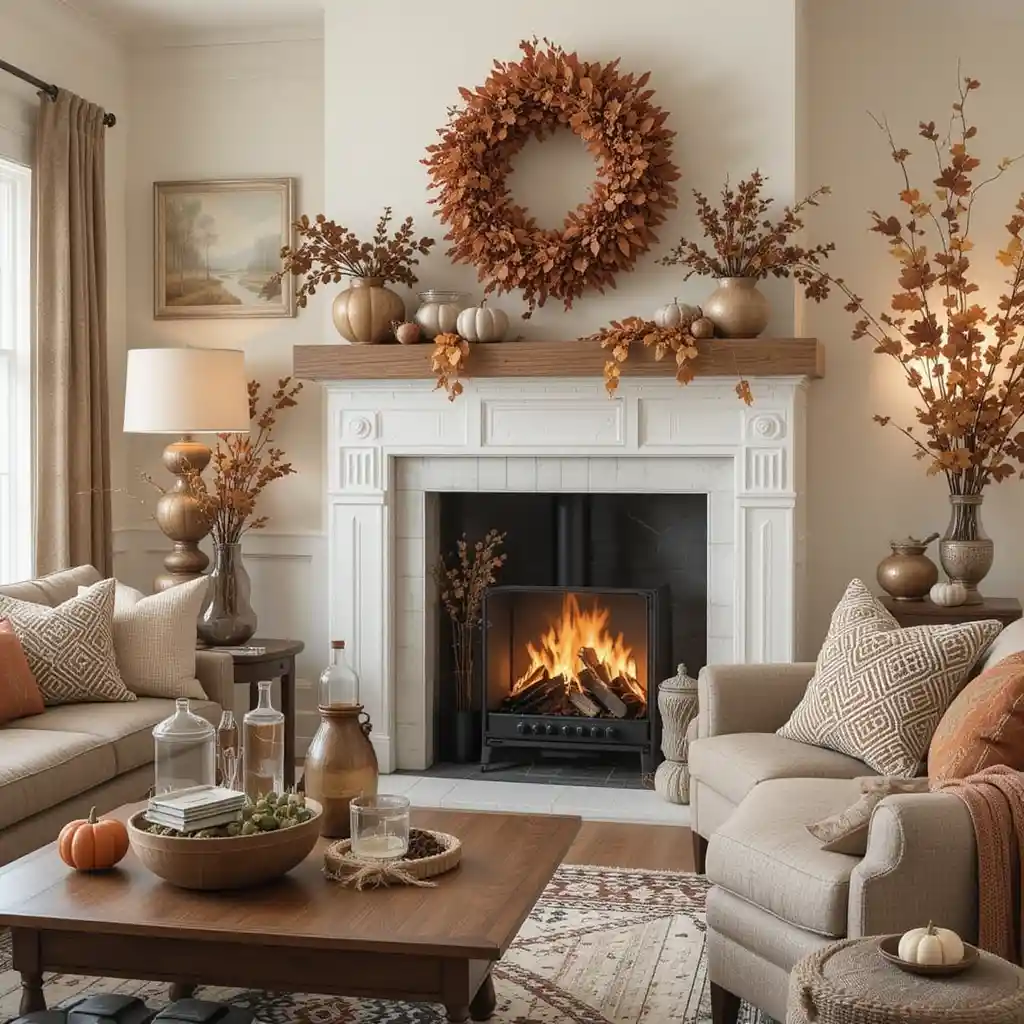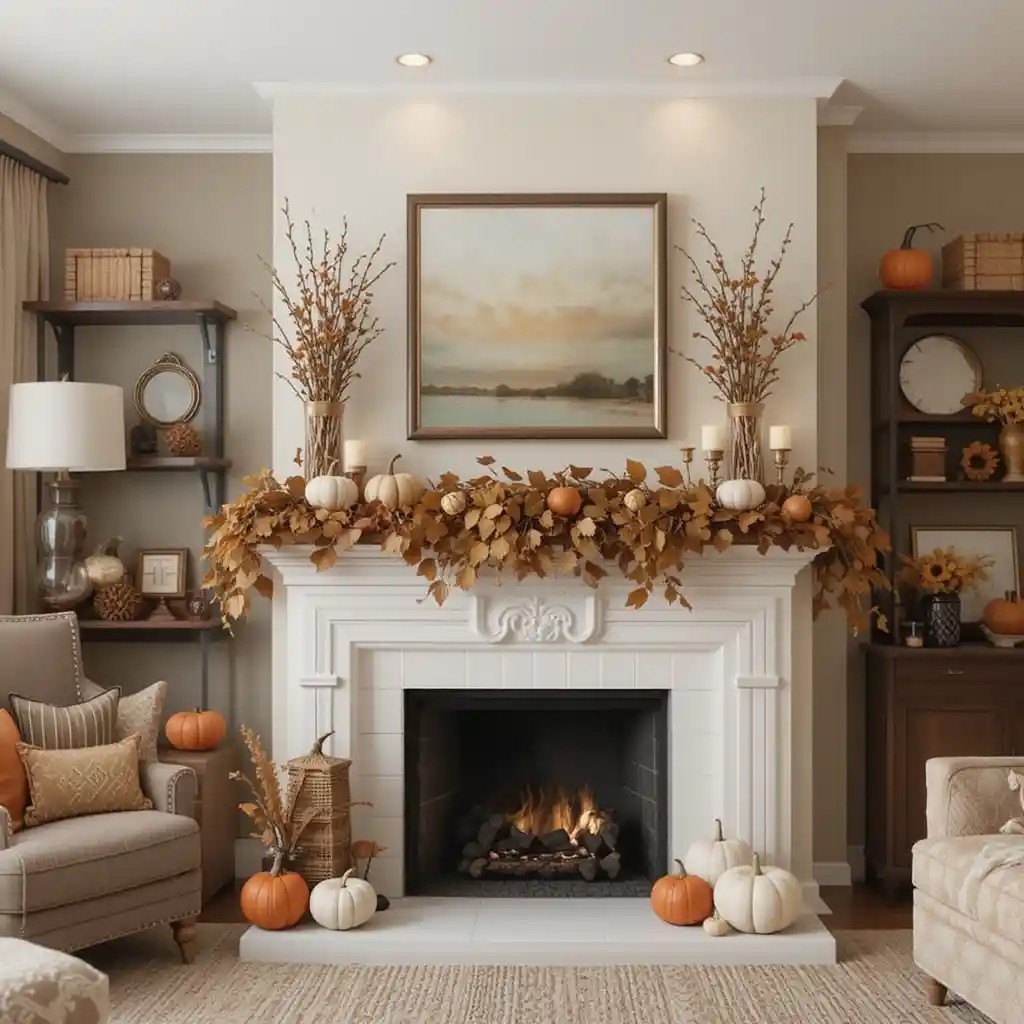 Line your fireplace mantel with a mix of small gourds, leaves, and candleholders for a balanced and festive focal point.