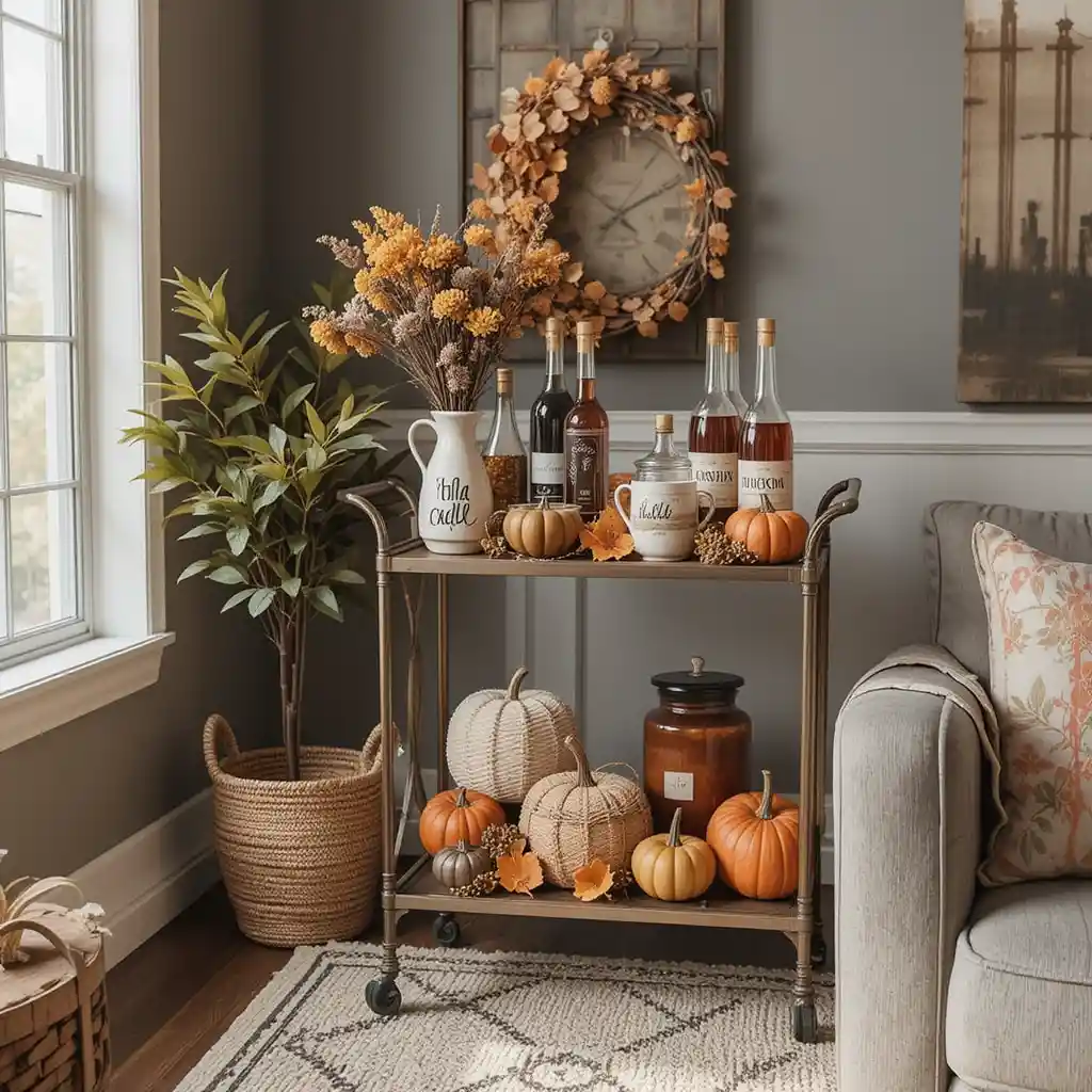 Transform your bar cart with fall-themed mugs, syrups, and mini pumpkins to create a cozy corner for warm drinks and entertaining.