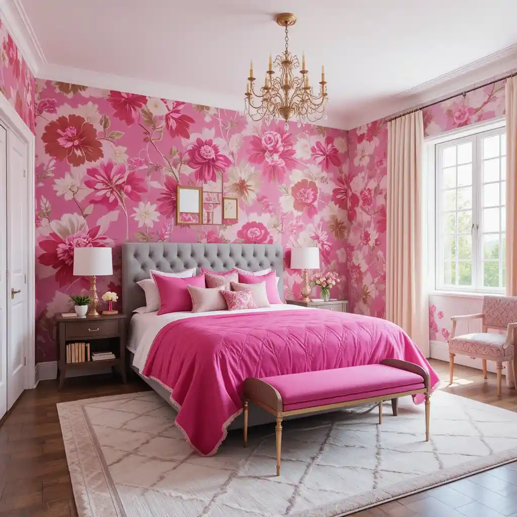 Cover one or two walls with bold floral or geometric pink wallpaper to create depth, color, and visual interest. Hot Pink Bedroom Ideas