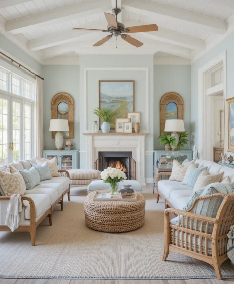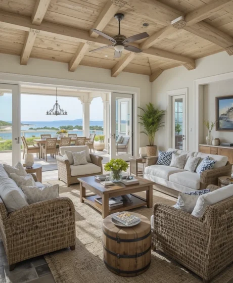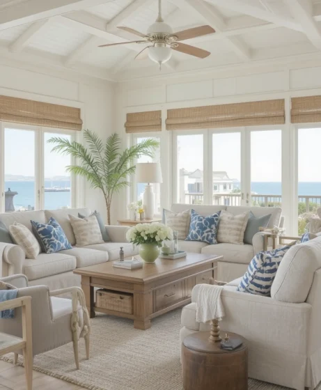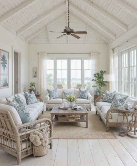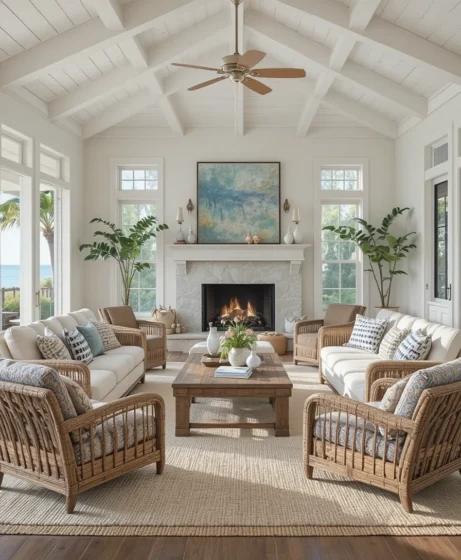 This style is inspired by coastal homes and tropical retreats, making any living room feel calm, stylish, and welcoming.