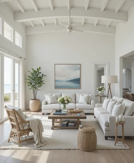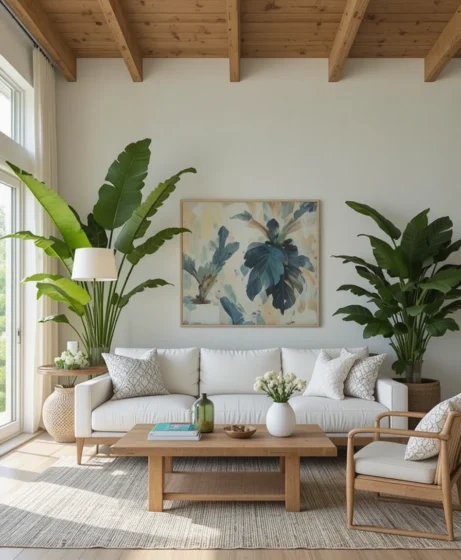 By blending light colors, organic textures, and open layouts, you can create a living room that feels like a peaceful island retreat every day.