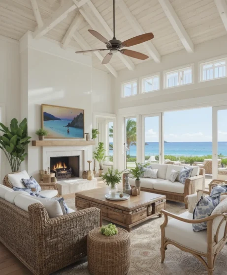 Ceiling fans improve comfort and support island style. Simple wood or white designs blend seamlessly. They are both practical and decorative Island Living Room Ideas.