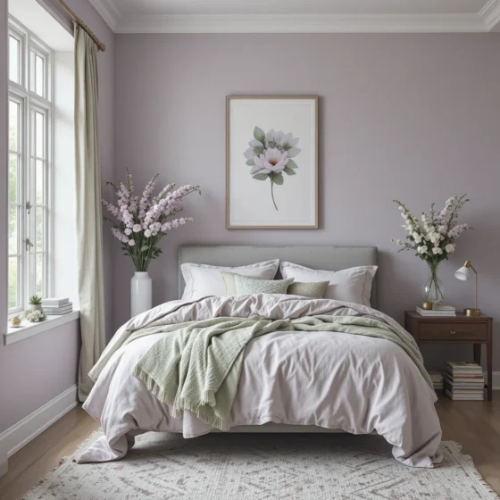 A gentle lavender paired with muted sage green creates a soft, vintage-inspired look perfect for bedrooms or reading corners Lavender + Green Color .