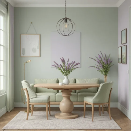 Soft lavender blended with pale seafoam green offers coastal calm for bedrooms or dining spaces Lavender + Green Color.