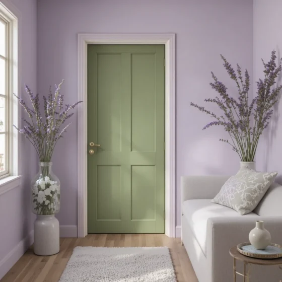 A pale lavender combined with warm, muted olive creates a serene, modern aesthetic.