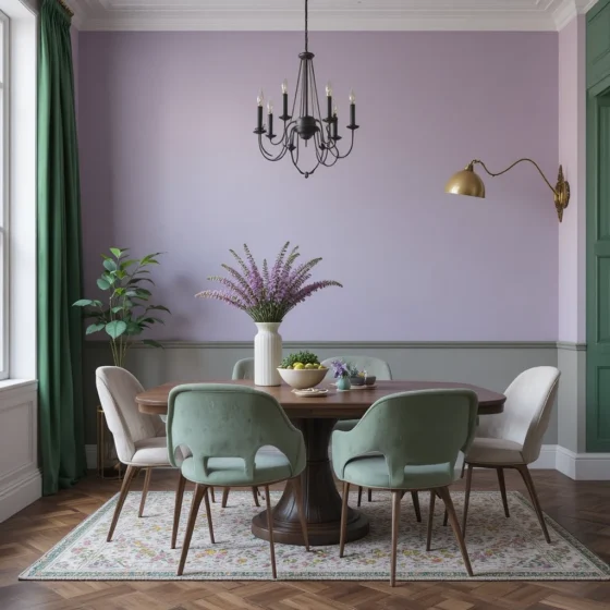 A soft lavender with deep forest green adds contrast and elegance for statement walls or dining rooms.