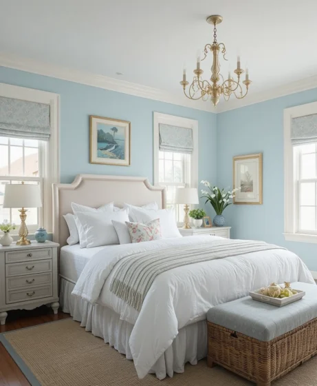 Painting your walls a soft light blue and pairing them with crisp white trims creates a clean and refreshing atmosphere. The contrast adds brightness and makes the room appear larger. This combination brings a timeless coastal feel without overwhelming the space.