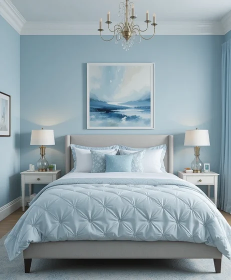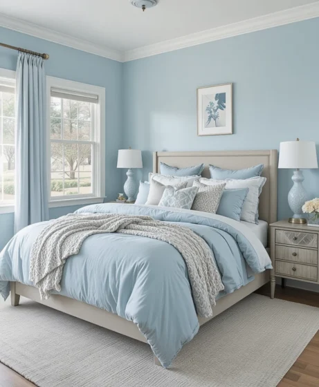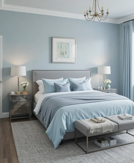 Combining light blue with gray creates a serene and modern look. Use gray furniture or bedding to complement the blue tones. This palette offers a minimalist, hotel-inspired vibe that feels instantly relaxing.