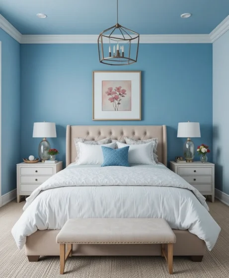 Painting the ceiling light blue mimics a peaceful sky and adds depth to your bedroom. It creates a surprising design moment without overwhelming the room. This idea works best with white or soft neutral walls Light Blue Bedroom.