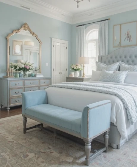 Place a light blue velvet bench at the foot of the bed for charm and function. It adds elegance, provides seating, and acts as a décor highlight. Velvet texture enhances richness while keeping the color soft Light Blue Bedroom.