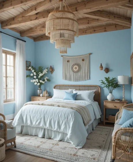 Mix light blue tones with rattan, macramé, and soft woven textures to create a boho-inspired bedroom. The blue adds calmness while the natural elements add warmth. This pairing feels relaxed, artistic, and inviting.