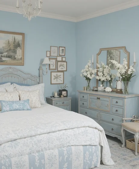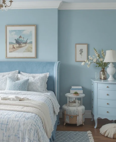 Light blue-washed wooden furniture gives the space a rustic yet refreshing vibe. Dressers, nightstands, or bedframes in this finish bring natural charm. It’s a great way to add character without overpowering the room Light Blue Bedroom.