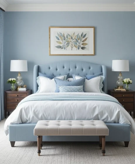 A light blue upholstered headboard adds sophistication and color to your bedroom. It creates a focal point that enhances comfort and improves visual balance. Choose a velvet or linen fabric for a high-end look that blends beautifully with neutral bedding Light Blue Bedroom.