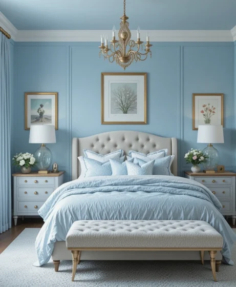 Pairing light blue with gold instantly elevates the room’s elegance. Gold lamps, frames, and hardware add warmth and shine to the cool blue tones. This combination feels luxurious and is perfect for anyone who wants a chic, modern finish.
