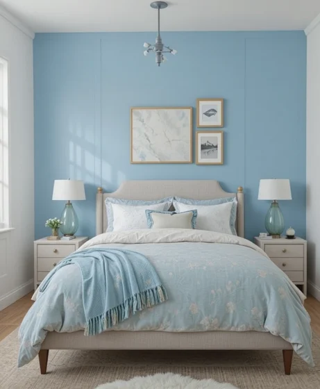 If you prefer subtle color, a single light blue accent wall is the perfect option. It highlights your bed area and gives the room a modern touch. Combine it with white, gray, or beige walls for an airy balance.