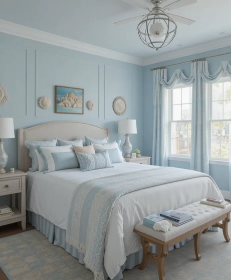 Incorporate driftwood, seashell décor, and striped fabrics alongside light blue tones. This coastal combination creates a soothing, beach-inspired environment. The look is clean, airy, and perfect for a peaceful bedroom escape Light Blue Bedroom.