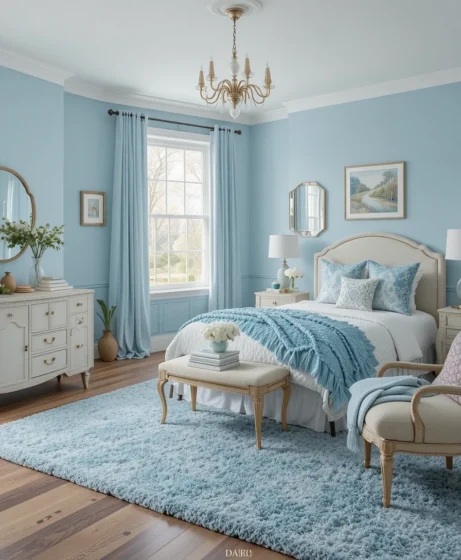 A light blue rug anchors the room and ties the décor together. It adds warmth underfoot and brings harmony to neutral-colored furniture. This choice works especially well in bedrooms with hardwood floors Light Blue Bedroom.