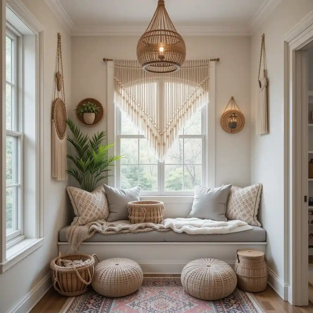 Create a bohemian-inspired nook with macramé wall hangings, woven baskets, and patterned floor cushions. Add string lights for cozy ambiance.